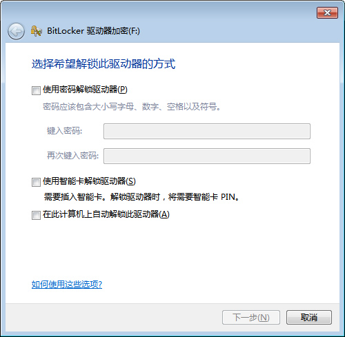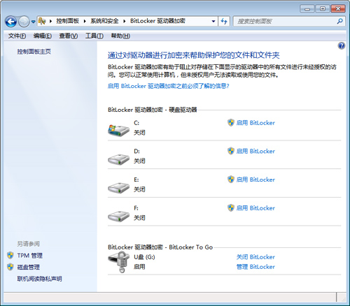 当在电脑上插入一个U盘之后,在“控制面板”-“系统和安全”-“BitLocker驱动器加密”里可以“启用BitLocker”功能,进入加密界面之后会发现与之前进行的本地驱动器加密过程完全相同。
