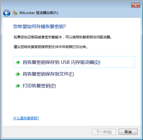 一般说来恢复密钥存放在USB闪存驱动器或打印出来中安全系数较好,因为那样的话,加密驱动器与恢复密钥分离保管,安全性较好,如果将恢复密钥保存在硬盘中,有可能会被第三方工具软件扫描获取到。