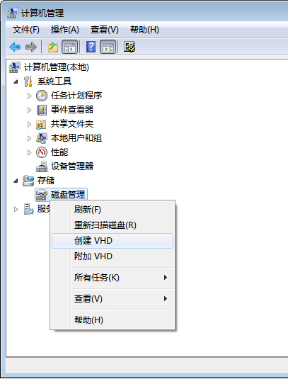 右键点击“计算机”选择“管理”,在“计算机管理”中我们点击“磁盘管理”,右键选择“创建VHD”。这里点击“浏览”或输入我们要创建的VHD的路径,确定后填入虚拟硬盘的大小,大小可以根据硬盘可用空间和自己的需求来决定,其他的可以选择默认。确定后,系统便会开始创建一个新的磁盘。
