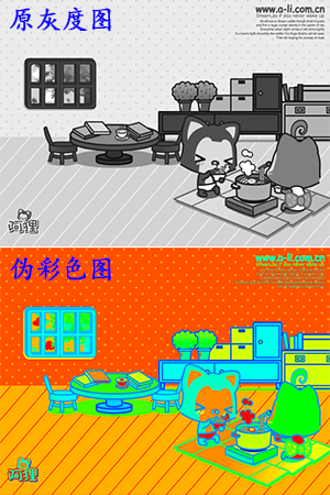 伪彩色处理是指将灰度图像转换成彩色图象。因为人眼对于彩色的分辨能力远高于对灰度图像的分辨能力,所以将灰度图像转换成彩色可以提高人眼对图像细节的辨别能力。伪彩色并不能真实的反映图像像的彩色情况。