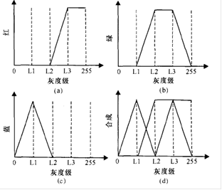 主要就是将图像通过不同变换特性的红、绿、蓝3个变换器,然后将三个颜色通道的输出合成某种颜色。由于三种颜色变换的不同,使得不同大小灰度级可以合成不同的颜色。一组典型的变换传递函数如下图。