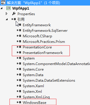 第二、在“新建项目”对话框中选择“WPF应用程序”,修改名称为WpfApp1,然后点击“确定”按钮,便成功创建了一个“WPF应用程序”。新创建的项目所引用的公共类库如下。如下图。(“WPF应用程序”会在“引用”里面自动添加下图中所示的 PresentationCore、PresentationFramework、WindowsBase三大核心程序集)。