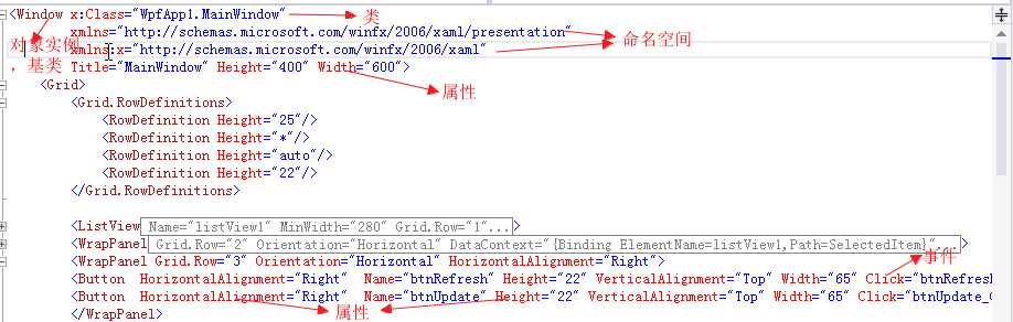 第五、在MainWindow.xaml的设计窗体中我们可以修改Title。还可以设置MainWindow的属性和添加事件。完成了这些设置以后,我们就可以对窗体添加内容了,如下图。我在这个窗体中添加了一个ListView、两个WrapPanel、两个Button等。