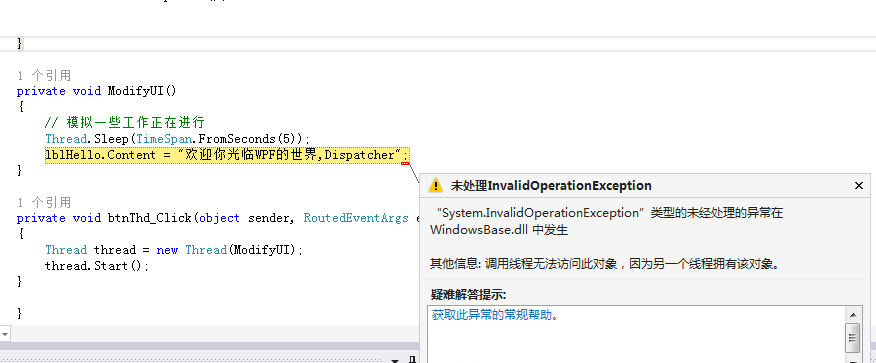 lblHello.Content = "欢迎你光临WPF的世界,Dispatcher";